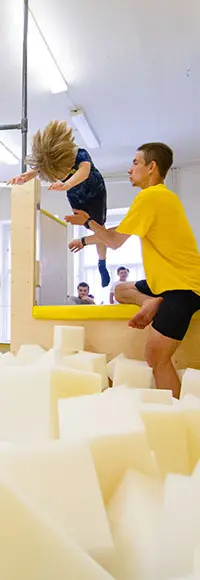 Máme speciální místnost s molitanovou jámou a extra měkkou duchnou. Tady se parkouristé učí náročnější triky do měkkého dopadu.