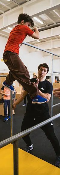 Trenér dává dopomoc při nácviku cat leapu během tréninku dospělých.