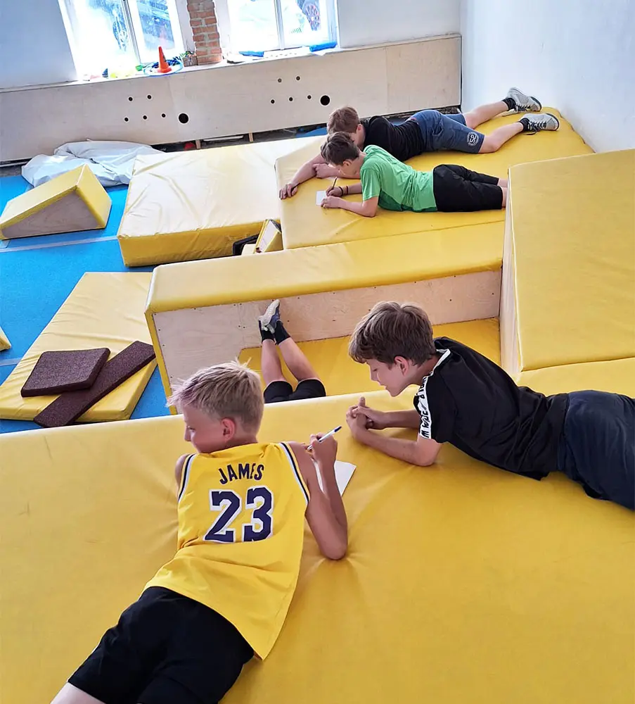 Nejen skákání, ale i různé klidové aktivity kolem. Na tomto táboře měly děti za úkol si psát takzvaný denník parkouristy, kam zaznamenávaly své úspěchy.
